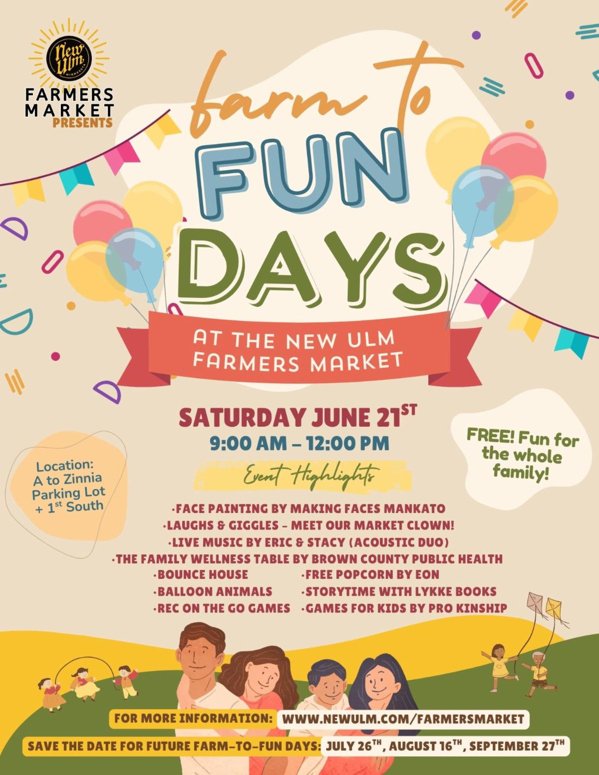 We are planning to make every market an experience for shoppers and the community. Almost every market will feature live music, and we’re adding kids activities and more to various markets throughout the season (especially on Saturdays). One Saturday a month, June-Sept, will be a special “Farm-To-Fun Day” at the market, where there will be extra family-friendly activities! These dates are: June 21, July 26, August 16, and September 27. Families, mark your calendars for those dates now! The full schedule of vendors and activities for every market can be found on the Farmers Market website (www.newulm.com/FarmersMarket). Click here for a flyer for the June 21st Farm-To-Fun Day.