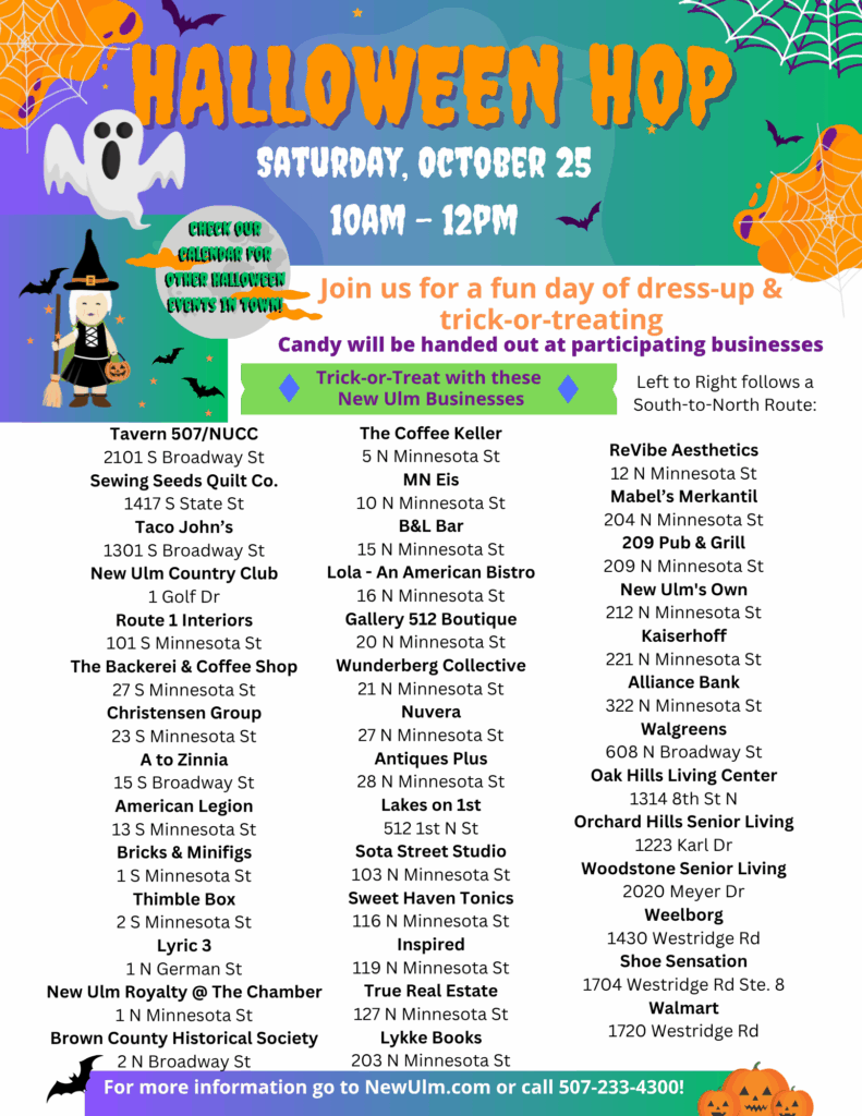 Whether you’re a little monster, a princess, or a superhero, the Halloween Hop is a beloved New Ulm tradition you won’t want to miss. Bring your family, your friends, and your best costumes—we can’t wait to see all the creative looks hitting the streets!