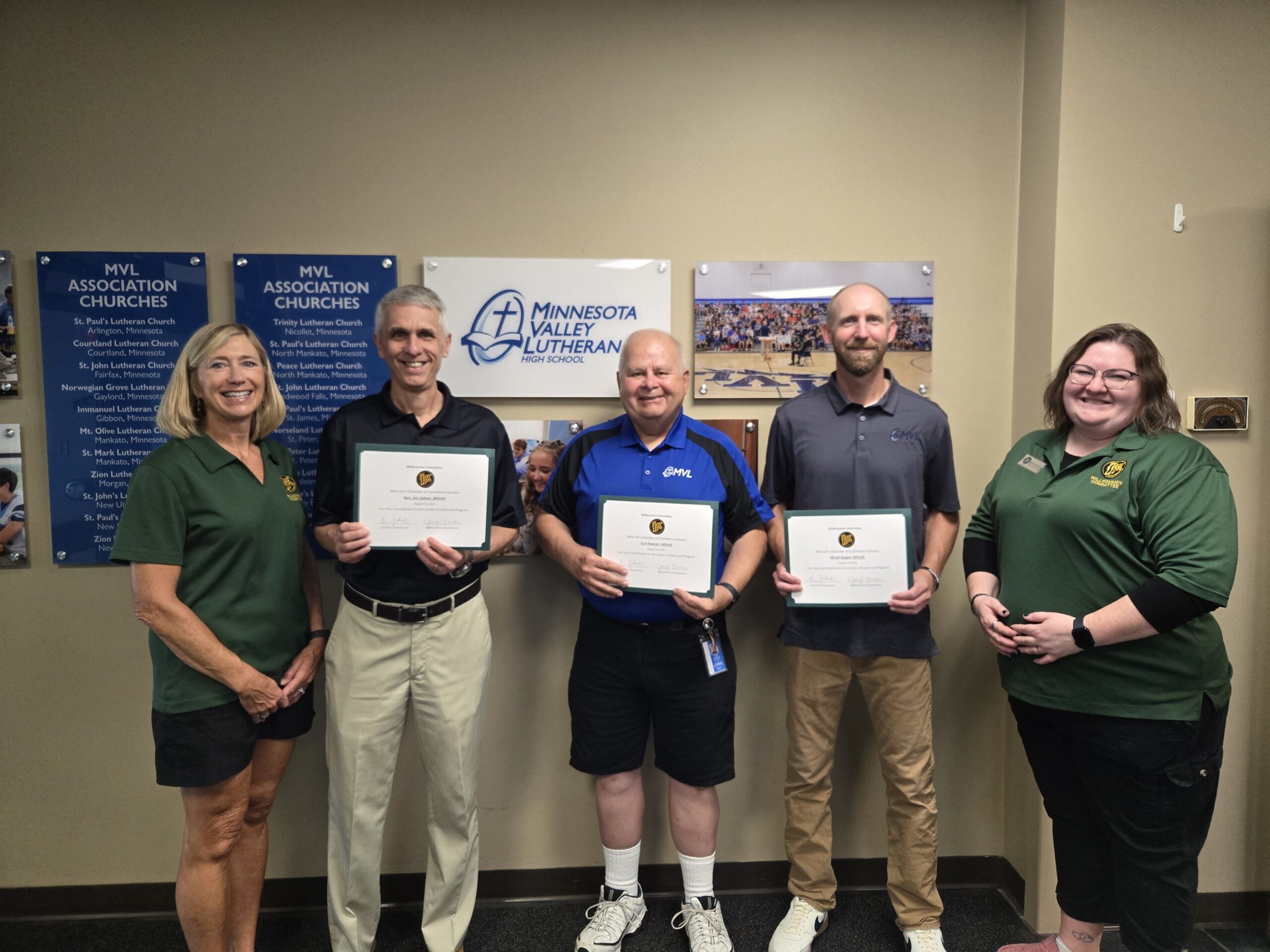 The Willkommen Committee of the New Ulm Area Chamber of Commerce recently visited Minnesota Valley Lutheran High School (MVLHS) to welcome new faculty members. MVLHS serves 270 students from a 50-mile radius with 22 faculty and 10 staff. The school offers advanced classes through its “Lead the Way” program as well as PSEO opportunities.