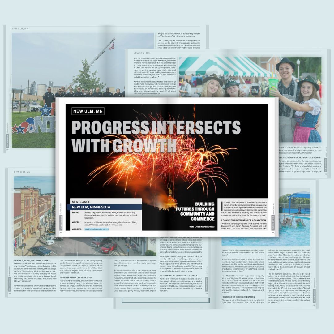 New Ulm’s unique blend of tradition and innovation is in the national spotlight once again. The October 2025 issue of Business View Magazine – a national publication that highlights economic development, business innovation, and community growth across North America – features New Ulm, Minnesota in an article titled “Progress Intersects with Growth,” highlighting how our community continues to thrive through collaboration, creativity, and strong local leadership.