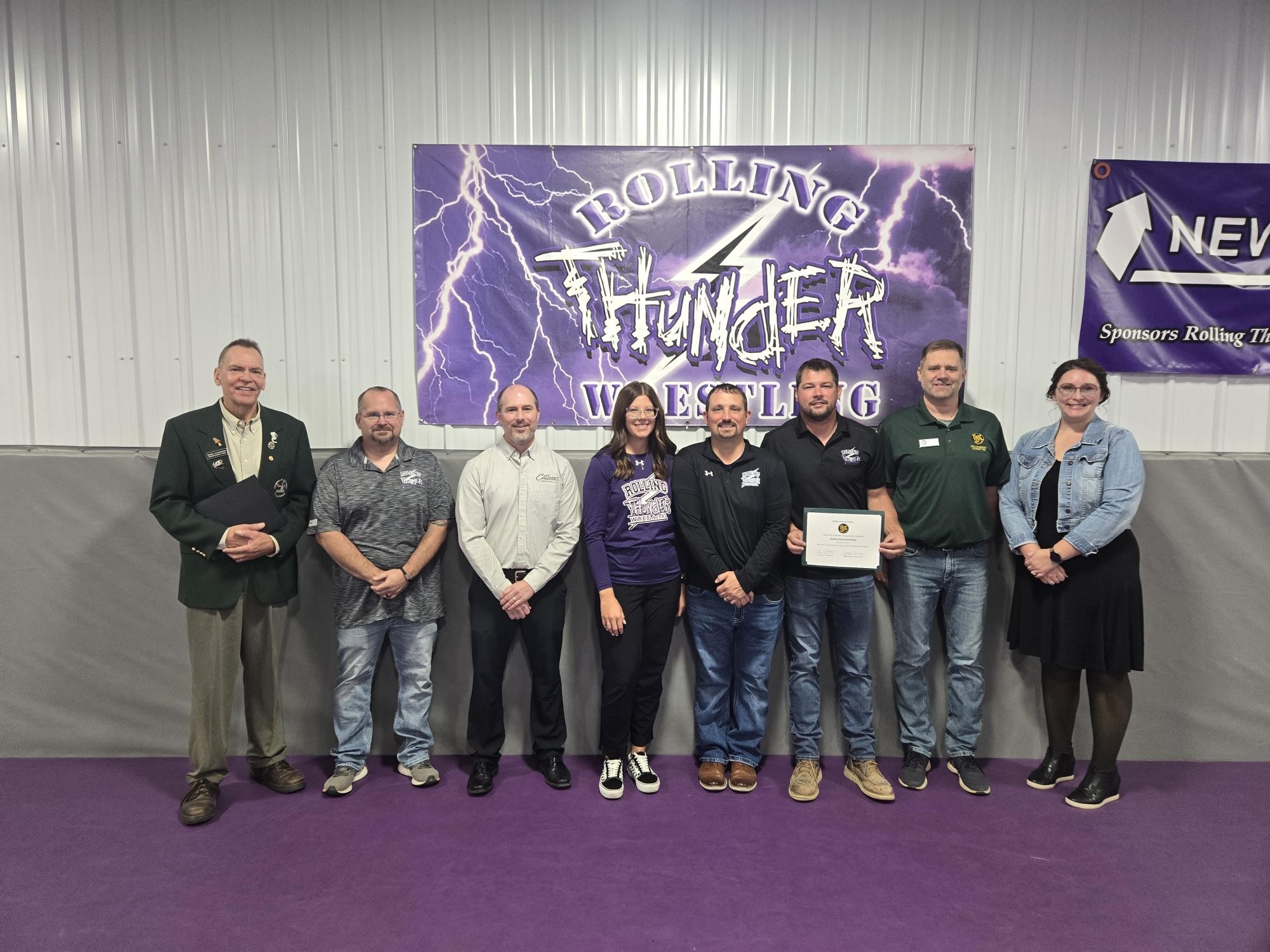 In this photo: Randy Schroeder, Frandsen Bank & Trust; RTW Board Members: Ryan Wieland, John Rieser, Brittney Schmiesing, Chad Cooreman, Adam Hofmann, Rolling Thunder Wrestling; Ryan Becker, New Ulm Steel; Crystal Johnson, New Ulm Chamber
